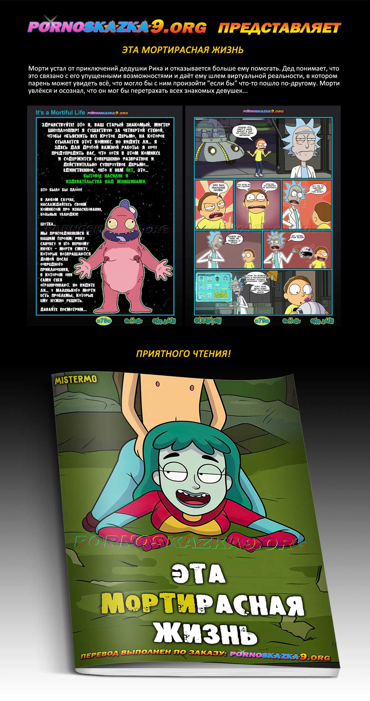 Порно комикс Эта Мортирасная жизнь. Морти устал от приключений дедушки Рика и отказывается больше ему помогать. Дед понимает, что это связано с его упущенными возможностями и даёт ему шлем виртуальной реальности, в котором парень может увидеть всё, что могло бы с ним произойти «если бы» что-то пошло по-другому. Морти увлёкся и осознал, что он мог бы перетрахать всех знакомых девушек…